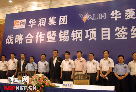 紅網(wǎng)長沙8月9日訊( 記者 劉怡斌 實習生 戴微佳 鄧威美 )今天中午,湖南華菱鋼鐵集團與華潤集團有限公司在長沙舉行戰(zhàn)略合作暨錫鋼項目簽約儀式。華菱集團將增資6.5億元持有錫鋼集團55%的股權,華潤集團繼續(xù)保留其在錫鋼集團45%的股權。湖南省委書記、省人大常委會主任張春賢等領導見證了這一盛舉。